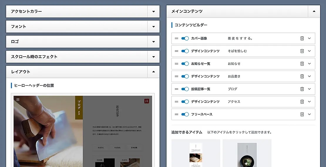 トップページもノーコードでお好みのコンテンツを表示できます。洗練かつ、最先端のデザインと日本とを調和させたWebサイトが作成できます。