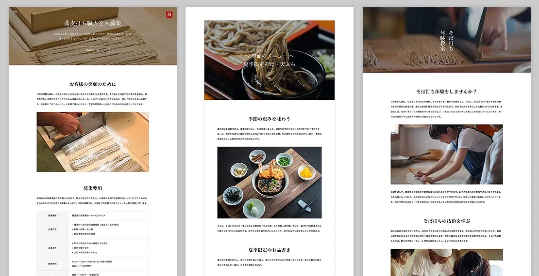飲食店のサイトは、トップページに加え、メニューページ、アバウト・アクセスページがあれば、必要最低限の要件を満たします。それでも「店名 地域名」で検索した時にヒットすれば、アクセスが流れてきます。