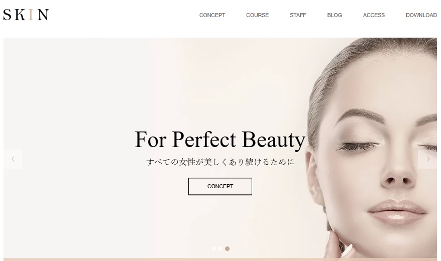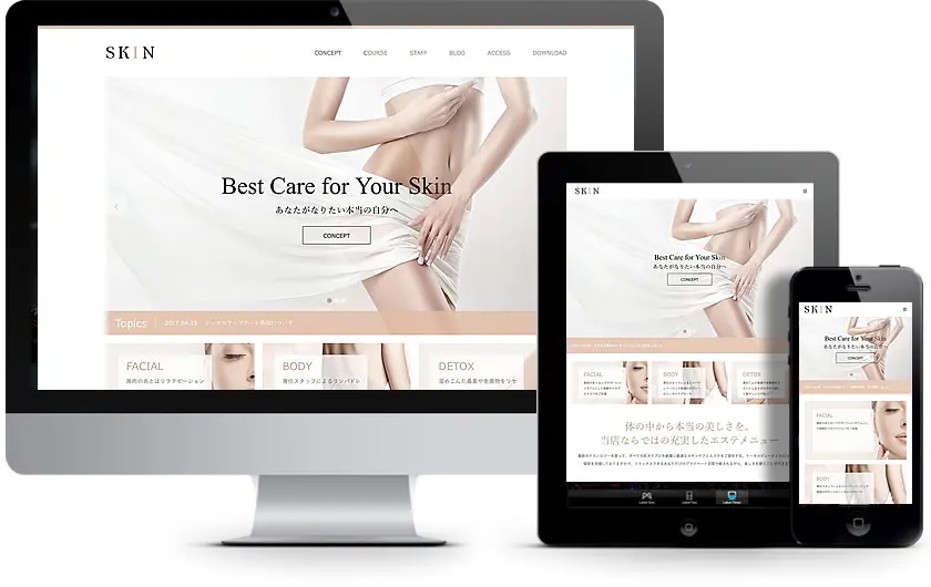 もしあなたが論理的な文章を書くことが得意ではなく、マーケティングに詳しくなかったとしても「SKIN」をそのまま活用いただくことで、予約・問い合わせまでの導線が確保されたトップページが完成します。