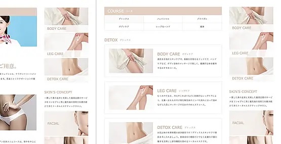 一般的なランディングページはワンカラム仕様が支流になってきていますが、SKINではあえて日本人の感覚に馴染みやすい2カラムレイアウトのランディングページになっています。これは、短い文章と画像との組み合わせだけで女性客のイメージを膨らませ、安心してページを閲覧してもらいながら、ナチュラルに予約・来店を促すための施策です。