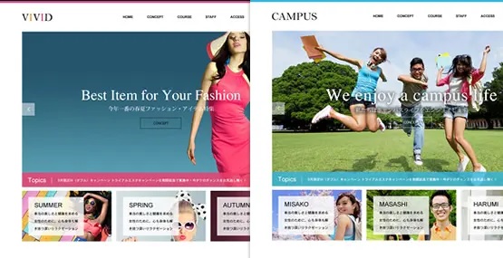 また、劇団や音楽バンドの「メンバー紹介用のホームページ」として活用することで、ファンを獲得し観客動員数を延ばしたり、野球やフットサルなどのスポーツクラブ、大学のサークルや同好会などの「会員用募集サイト」、地域会員が集まる「コミュニティーサイト」としても活用できる汎用性の高いテーマになっています。