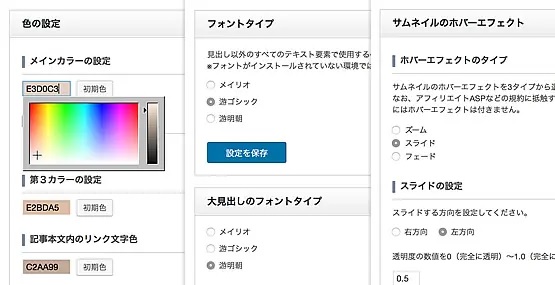 例えば、テーマオプション内のカラーピッカーを使った簡単な操作で、ホームページ全体のカラーをがらりと変えることができます。ロゴの設定やファビコンの設定だけではなく、文章や見出しのフォント(書体)も3種類から選んで設定することができます。