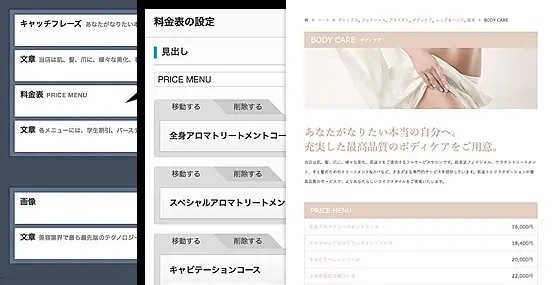 分割したコンテンツの中にスライダー、タブ、Googleマップ、見出し、キャッチフレーズなどを簡単に挿入することができます。さらに「SKIN」では、サロン系店舗ホームページとして重要なポイントになる「プライスメニュー」「店舗営業日」「スタッフ出勤表」を作ることができる新機能を追加しました。ぜひ革命的な機能をご活用ください。