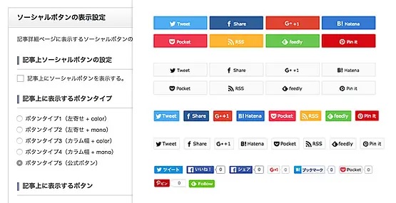 そこで、TCDテーマでは全テーマに、X、Facebookイイネボタン・シェアボタン、はてなブックマーク、Pocket、Feedly、RSS、Pinterestの計7つのSNSに対応したボタンをご用意しており、それぞれのSNSボタンごとに表示・非表示の選択が可能です。