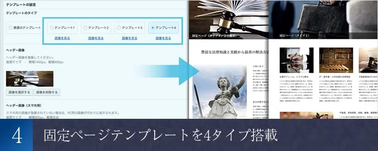 「LAW」の隠れたウリとして、固定ページテンプレートのデザインが下記のように4タイプ搭載されています。下記以外にもランディングページなどに使える1カラム(サイド無し)テンプレートも実装されています。デフォルトで美しいレイアウトのテンプレートが付いてくるのですが、この機能はあなたの価値あるサイト作りにきっと役に立ってくるはずだと確信しています。