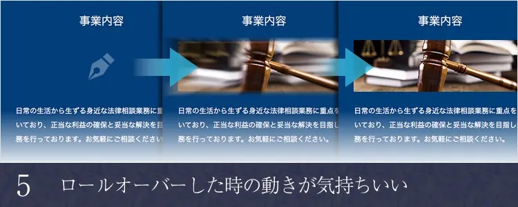 先進的なサイトはホバーアクションまで気持ちの良い動きをしています。マウスを画像やテキストリンクの上に置いた時のホバーアクションが美しいか、サイトデザインとマッチしているかどうかは、現代のサイトデザインの世界ではとても重要なのです。