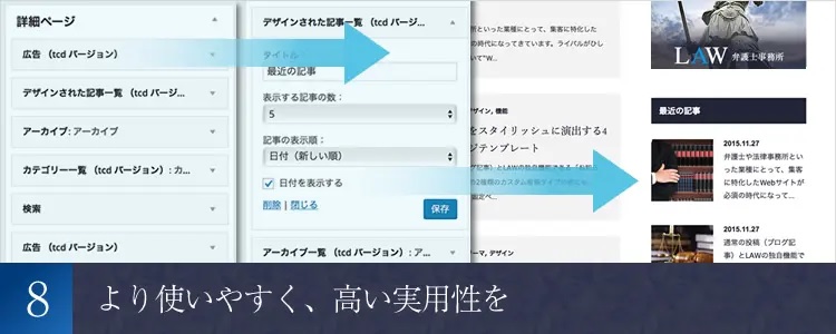 さらに、TCDではおなじみの「おすすめ記事」をアイキャッチ付きで表示するウィジェットも記事をランダムに表示させたり、表示する記事数を制御したり、日付や抜粋の表示の有無を選択できたりとかなり高機能化致しました。このような汎用性の高さも大規模サイトを運営するために必要な機能の一つです。