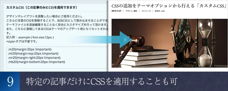 また、特定の記事にこのCSSだけ適用したいということがあると思います。例えば、この記事だけ見出しデザインを変えたいといった場合。そんな時にはこのカスタムCSSを使えば、より簡単に記事の執筆が可能となります。