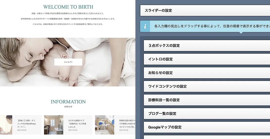 ヘッダー1つとっても、かなり自由度が高く、実用性も高いのが特徴です。キャッチコピーを引き立たせ、見るものの興味を惹きつけ、どういう病院なのかという情報を的確に伝えられるヘッダーが「BIRTH」には実装されています。