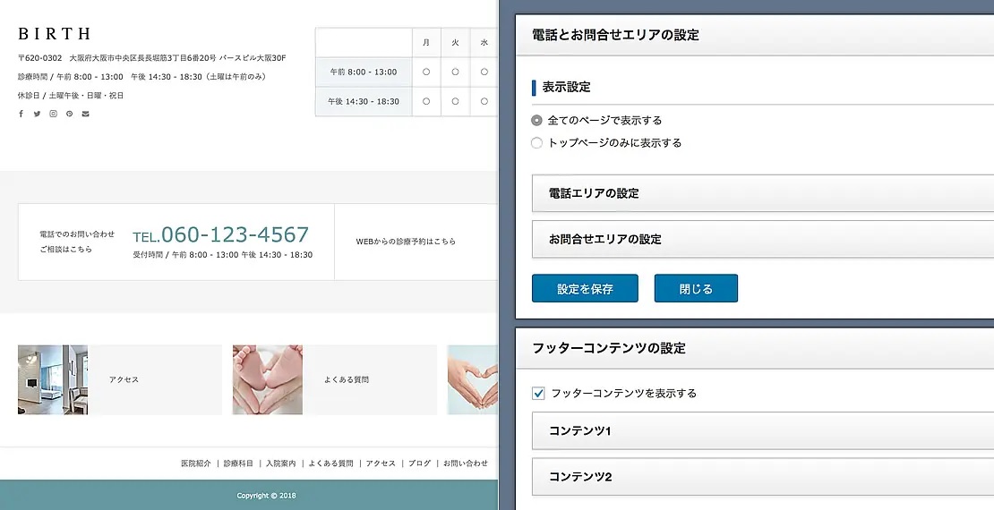 BIRTHではフッターエリアに電話番号や受付時間、予約ボタンなどユーザーのアクションに直結する情報を病院やクリニックのサイトイメージに適したデザインで掲載することができます。この施策が中長期において他社との差別化に繋がると考えています。