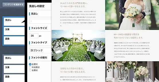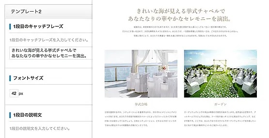 また長々と論理的な文章を用意する必要もありません。式場の雰囲気が分かる美しい画像とお客様の理想がイメージできる言葉を用意して、後は「TCDテーマオプション」から手順通りに進めるだけでデモサイトのような美しいサイトが完成します。
