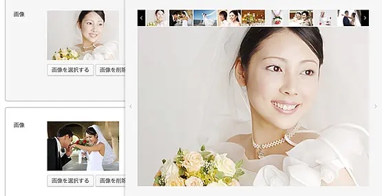 このギャラリーページでは、横長のワンサイズでリサイズするのではなく、ウェディングドレス着用などの写真を美しく魅せるために、縦長画像にも対応した”こだわりのギャラリー”となっています。