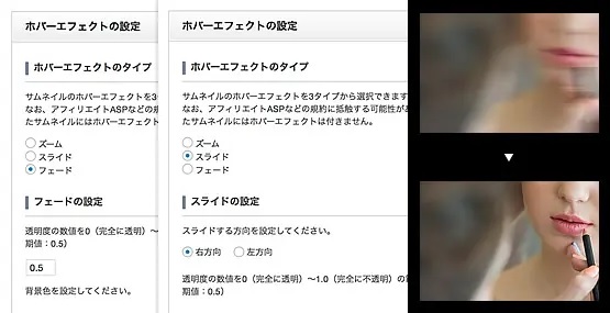 設定は実に簡単です。TCDテーマオプションからチェック一つで変更が可能です。また、写真の背景色や透明度も変更することができ、それぞれ拡大率やスライドの方向、フェードの透過率や背景色など細かい微調整もできます。他にはない高機能かつ最先端のロールオーバーアクションを体感してください。