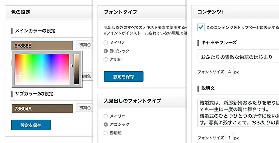 例えば、テーマオプション内のカラーピッカーを使った簡単な操作で、ホームページ全体のカラーをがらりと変えることができます。ロゴの設定やファビコンの設定だけではなく、文章を3種類から、見出しのフォントも2種類から選んで設定することができます。
