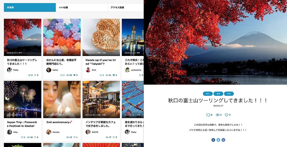 自分の投稿がどんどん増えていく充実感、投稿記事が他のユーザーの目に留まり、いいね・フォローを押される喜び。使っていくうちに自然と愛着がこみ上げてくる楽しいSNSサイトをきっと体感いただけるはずです。