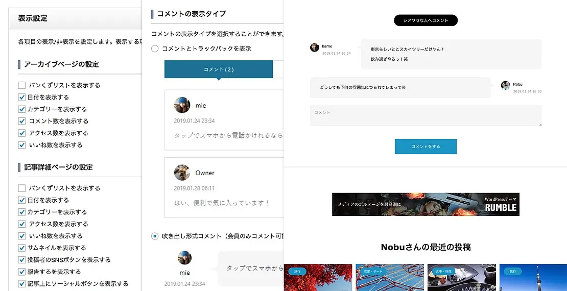 ・日付・カテゴリ・タグ・投稿者名・コメント・SNSボタン表示選択機能