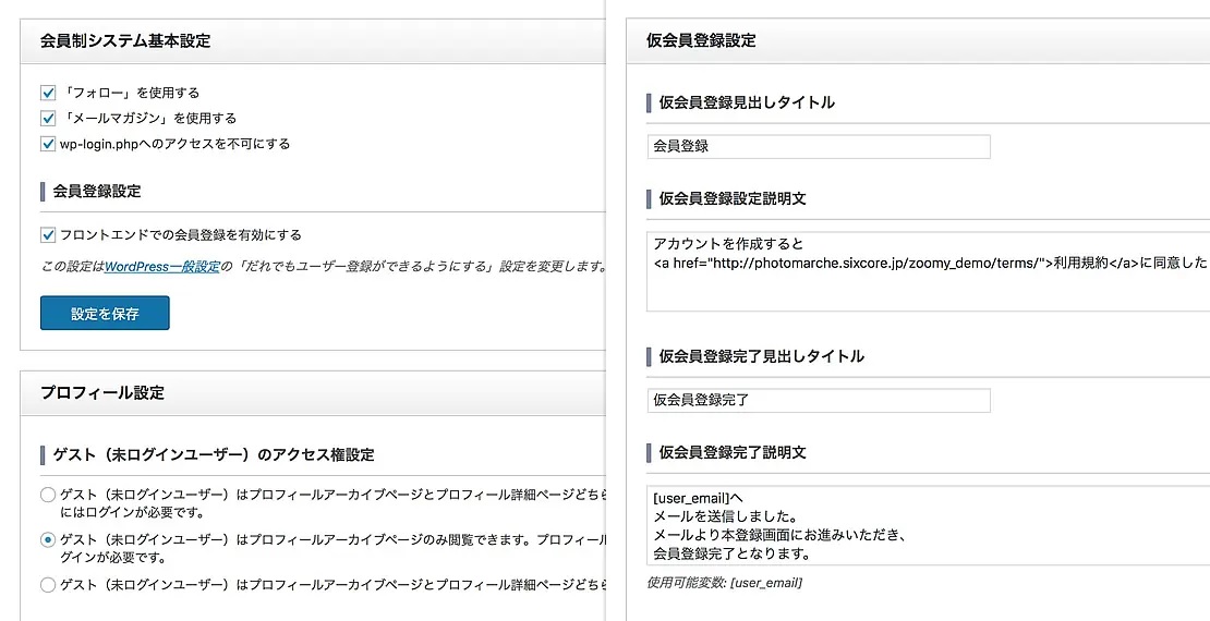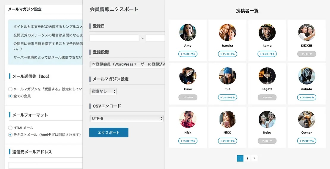 また、将来のプランに柔軟に対応することができるよう、ユーザー名簿を管理者独自に作成したり、メルマガ配信システムを移行する際に便利な会員リストのエクスポート機能も搭載しています。会員管理機能だけでなく、収益化に則したマーケティングオプションが用意されているのは当テーマの大きな特長です。