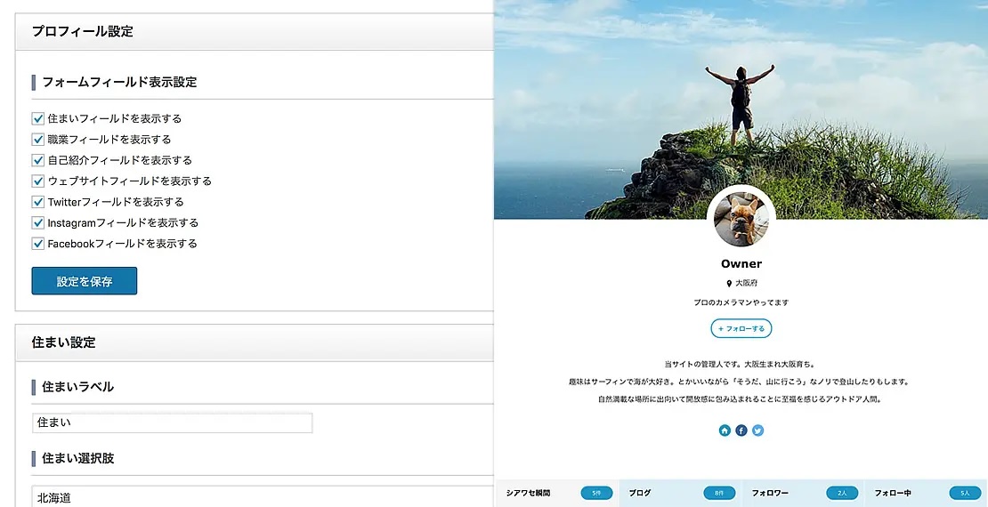 「ZOOMY」では管理者経験の有無を問わず、どなたでも簡単に自分の色が出せる自由度の高い設計が可能です。例えば、会員登録フォームは、入力項目は自由に選択でき、サイトのニーズに合った顧客情報を取捨選択できるのが特徴です。また、プロフィール機能はヘッダー画像とプロフィール画像でフィールドを見やすく区分けされ、個々の会員が作成したプロフィールページは一つのコンテンツとして相応しい出来に仕上がります。