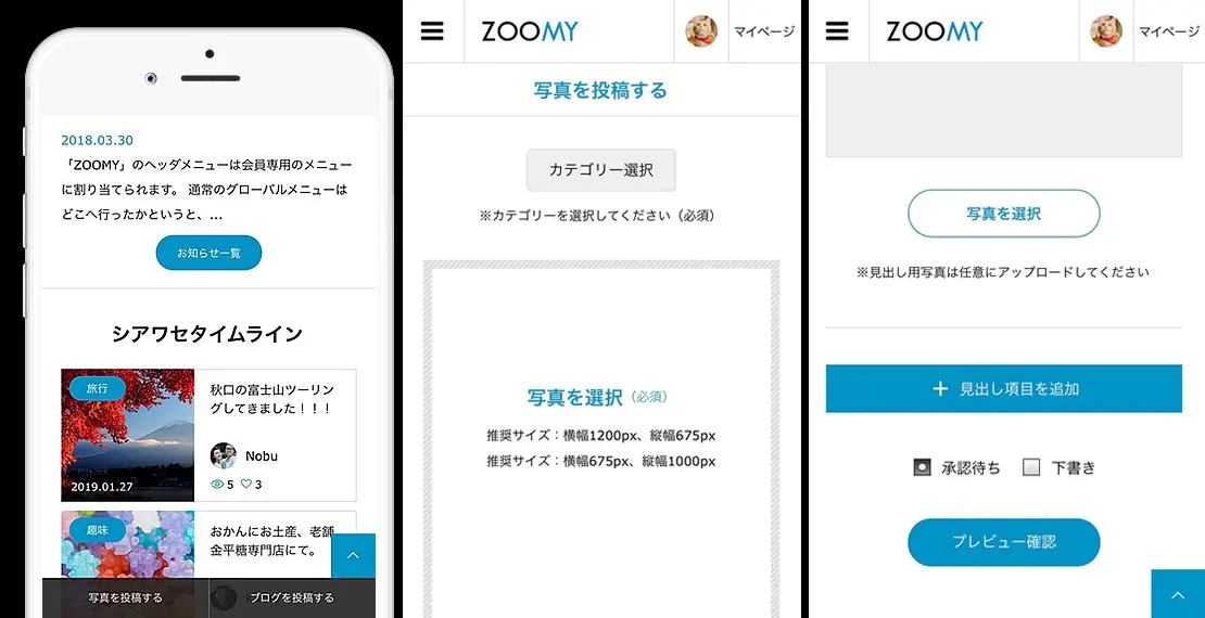 ユーザーの会員登録、マイページ、フォト・ブログのアップロード機能だけでなく、