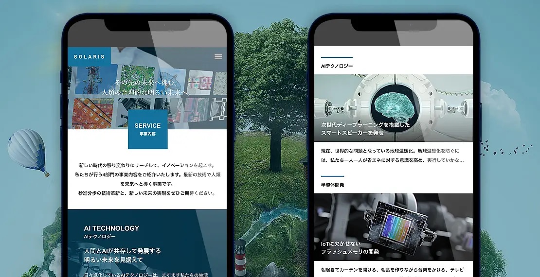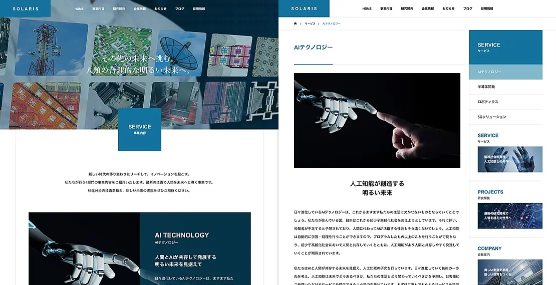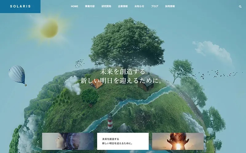コーポレートサイトは、あなたの事業をただ羅列して紹介するのではなく、サービスがいかに素晴らしいかを印象付ける必要があります。事業紹介ページにも力を入れた「SOLARIS」では、あなたの会社が社会に貢献していることを印象づけることができます。