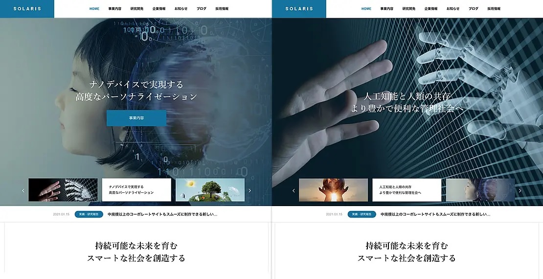 大企業、最先端のテクノロジー企業のような質の高いコーポレートサイトが誰でも作成できるように「SOLARIS」はつくられています。トップページの迫力はまさにそのもので、巷に出回るWordPressテーマでは再現は不可能です。