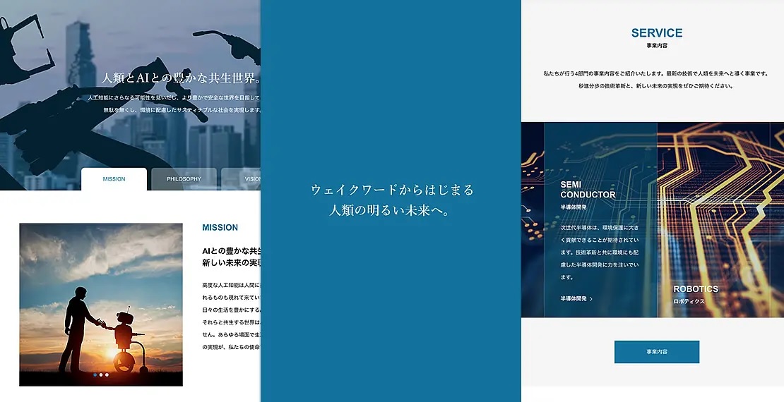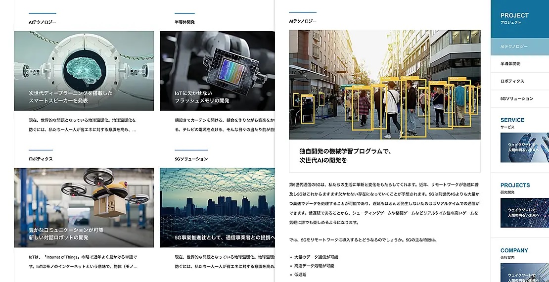企業のプロジェクト・サービス・研究開発を世界に発信するページ群。