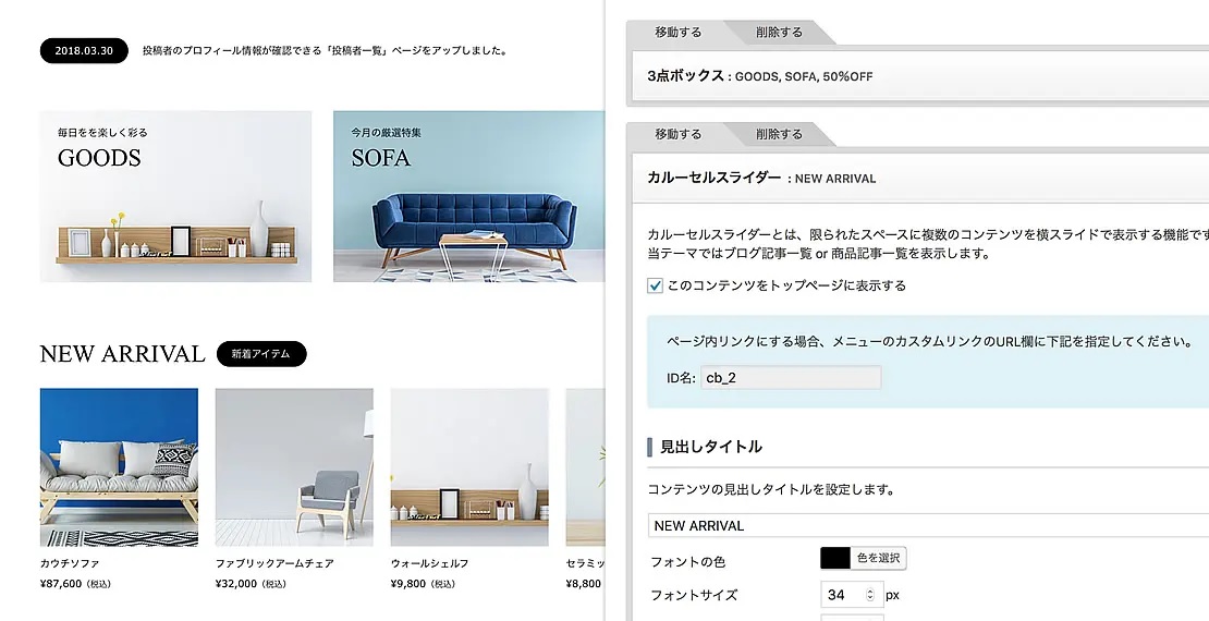 「ICONIC」では、指定の商品ページや記事へ誘導するトップヘッダースライダー、オリジナルコンテンツが挿入できる汎用性の高い「バナー」「3点ボックス」「カルーセルスライダー」、お知らせをコンパクトに表示するニュースティッカーなどトップページを華麗に彩るコンテンツを豊富に用意しています。