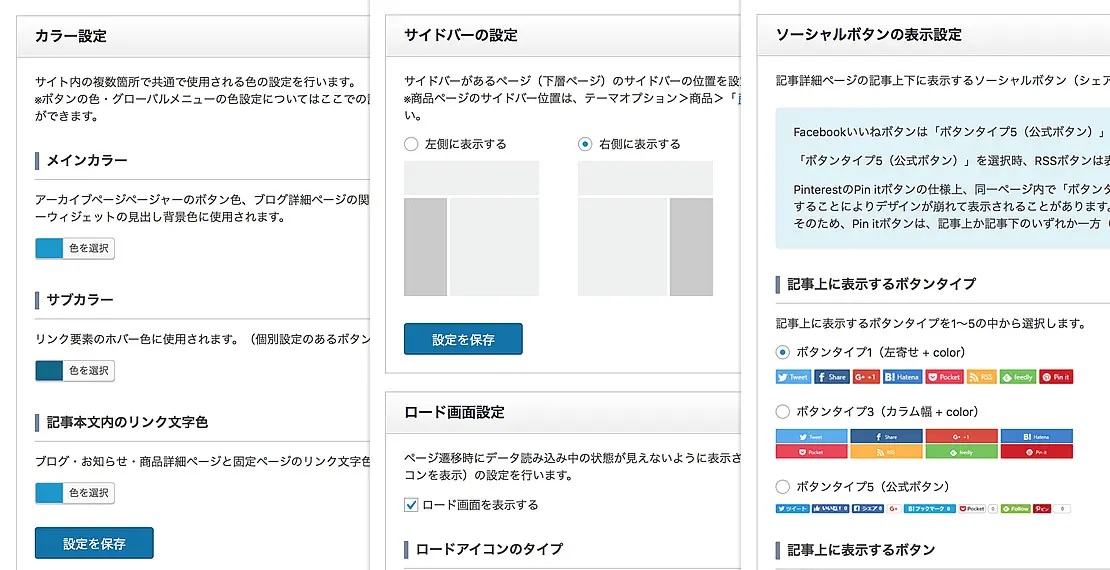 商品ページやその他下層ページにおいて個別にカラムの左右を選択できるレイアウト変更機能や、商品ページを含むすべてのページの各要素でフォントサイズ・カラーが詳細に設定できる機能、商品ページ下部の商品レコメンド掲載機能など、TCDテーマオプションはユーザーの要望にクリック一つで応えます。