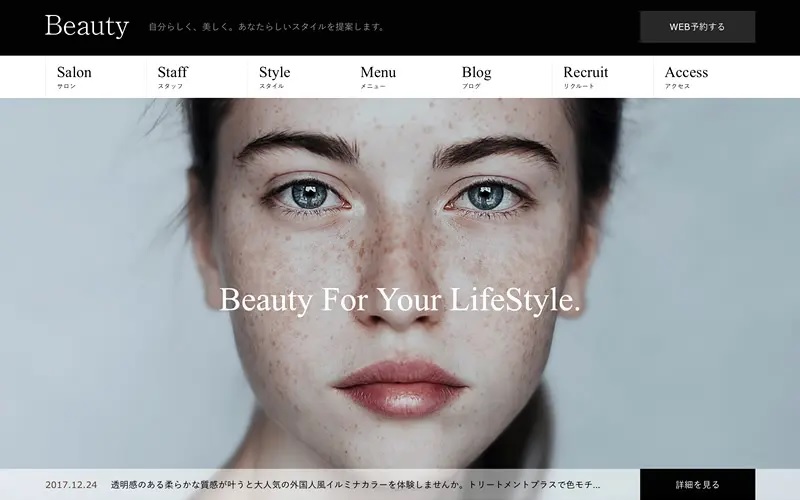 美容室のウェブサイトが構築できる「Beauty」は、訪問者が初めて見た時に、一瞬にしてハートを射止める迫力あるヘッダースライダーが実装されています。