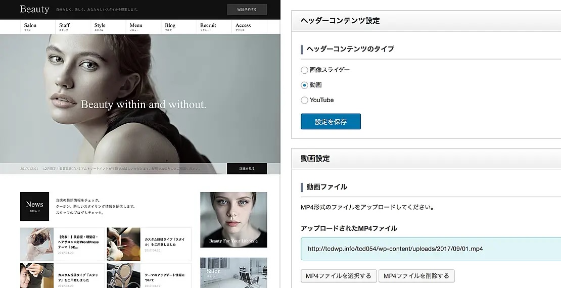 スライダーには最大5枚まで静止画像を設定できる他、動画(MP4,Youtube)も設定可能です。スライダー画像の上にはテーマオプションから文章も入れられるので、専門的な知識は一切必要ありません。画像をアップして、文章を書くだけです。