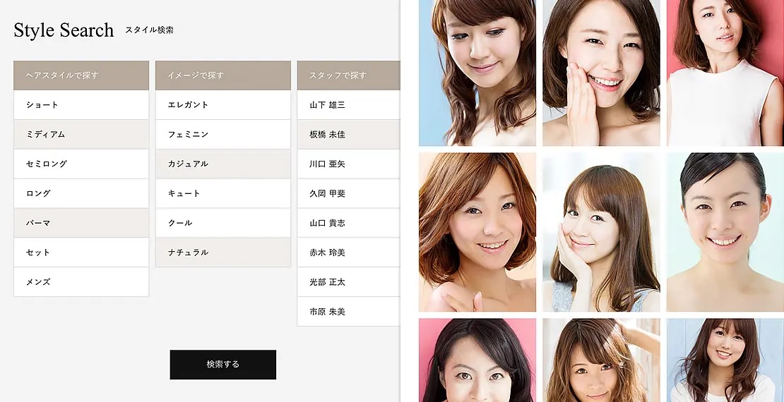 カットモデルを使ったヘアスタイル集は、お店の実績でもあり、重要なアピールポイントです。「Beauty」テーマでは、訪問者が希望のヘアスタイルがすぐ見つけられるよう、高度な検索機能が実装されています。下記ページをご覧ください。