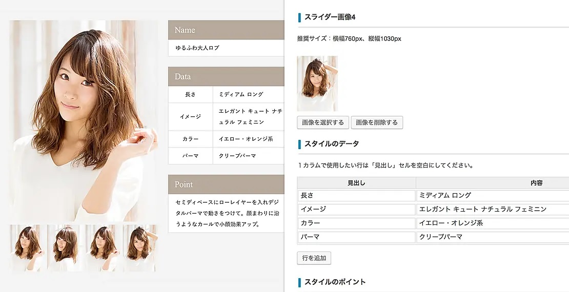 お店の紹介ページやヘアスタイルの紹介記事を作るときにも活躍する画像スライダーコンテンツ