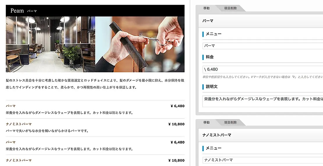 ヘアサロン店舗のホームページには、カットやカラー、パーマ、トリートメントなど、各種メニューや料金表が掲載されたページは必要不可欠です。