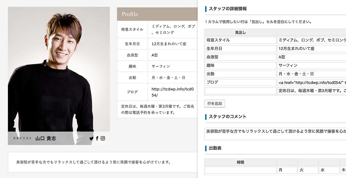 お客様にとって安心感につながる「スタッフ紹介ぺージ」に、スタイリストが担当したヘアスタイル写真や出勤表を表示すれば、「来週末このスタイリストさんにお願いしようかな?」と、期待感を膨らませながら予約や来店のきっかけを与えます。
