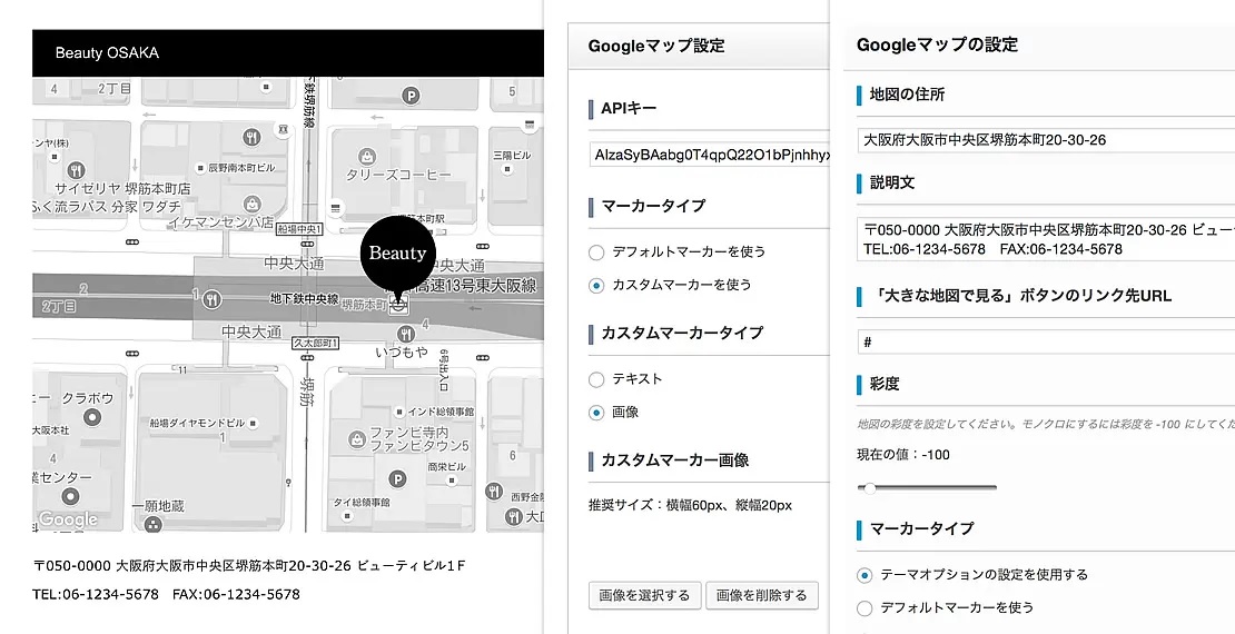 地図の彩度(モノクロ⇔カラー)は、パラメータをスライドすることで自由に調整できますので、ホームページのデザインにマッチさせましょう。さらに、地図の半分にオーバーレイをかけ、住所・電話番号などの「任意のテキスト」や、WEB予約ページへの「リンクボタン」を表示させることも可能です。