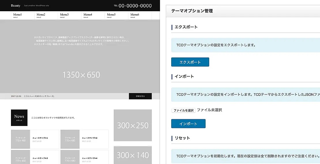 この工程を極限まで省くため「Beauty」では、簡単にデモサイトに近いレイアウトを再現する「テーマオプション管理機能」を実装しました。