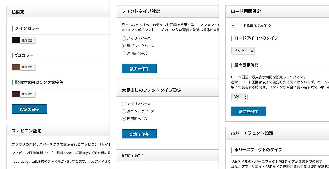 例えば、テーマオプション内のカラーピッカーを使った簡単な操作で、ホームページ全体のカラーをがらりと変えることができます。ロゴの設定ファビコンの設定だけではなく、文章や見出しのフォント(書体)も3種類から選べます